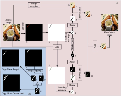 The specific generation flows are shown in Fig. 1 and Fig. 2. First, we manually select the tamper target through Labelme based on the Original Image and generate the corresponding mask. After obtaining the minimum rectangles e and f of the tamper target and resizing them using binary operations, the final copy-move forgery image is generated using the Region of Interest (ROI) selection algorithm in OpenCV. The representation of this workflow is illustrated in Figure 1 (I), while Figure 1 (II) presents the similarity flow for corresponding ground-truth generation.